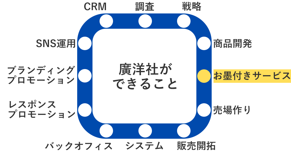 廣洋社は、『医師や専門家からのお墨付き』に関しては多数のメニューを展開しておりますので、お客様のご予算やニーズに合わせたご提案が可能です。